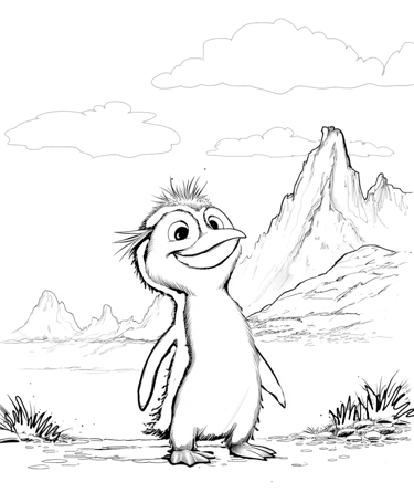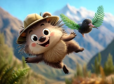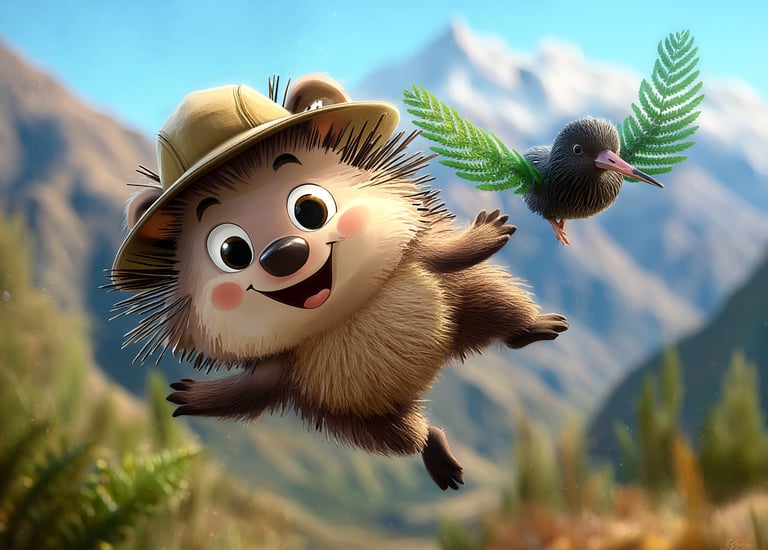 In the lush forests of New Zealand, a shy Kiwi bird tells Tumbleberry a secret: she wishes she could fly just once to see the top of the Southern Alps. Tumbleberry finds a giant, magical fern leaf that might just work as a wing! Describe their flight over the mountains. What do they see from high up in the clouds?